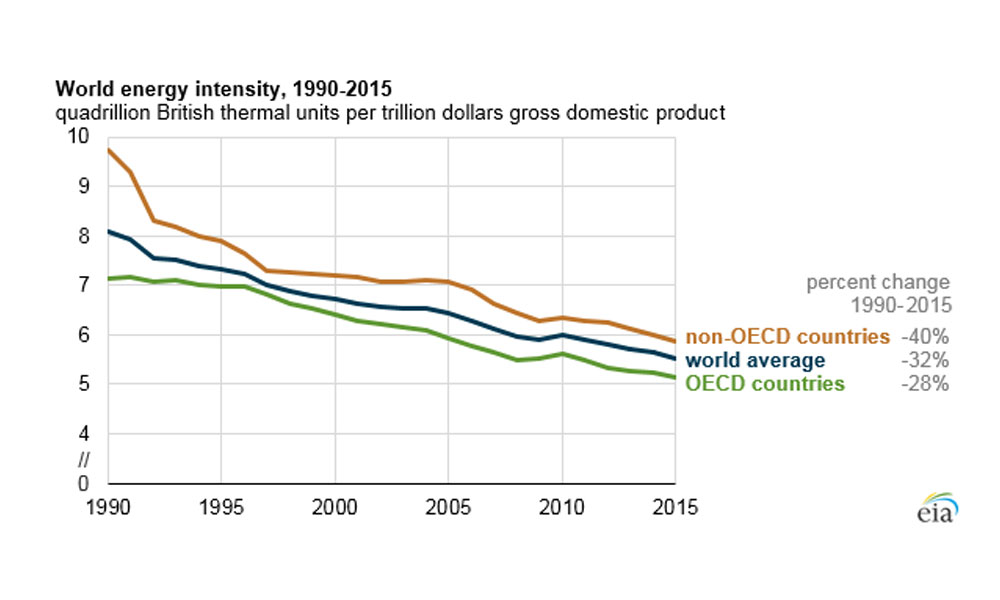 La agencia norteamericana ha tomado como base el último informe de previsiones energéticas, elaborado por la EIA, que intenta desvelar las tendencias en el mercado mundial de la energía. Para llegar a estas conclusiones el organismo americano ha medido cómo el consumo de energía por unidad del Producto Interior Bruto (PIB) se redujo en casi un tercio entre la intensidad de la energía medida entre los años 1990 y 2015 . Según el informe, la intensidad de energía ha disminuido en casi todas las regiones del mundo, tanto en las economías de la Organización para la Cooperación y el Desarrollo Económico (OCDE) como en las naciones emergentes.