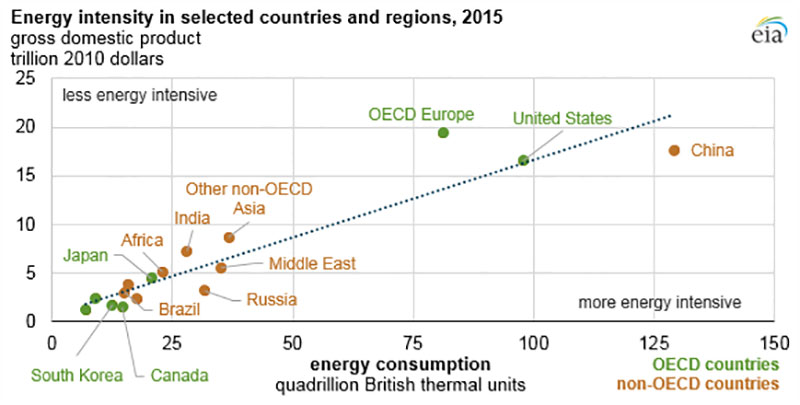 Históricamente, los niveles de intensidad de energía en los países fuera de la OCDE han sido más altos que los niveles de los países desarrollados. En muchos países que están fuera de la OCDE, las economías se han industrializando y se basan en formas más intensivas de uso de energía. Por el contrario, muchos países de la OCDE han pasado de depender de una producción intensiva en energía a un uso menor para actividades económicas basadas más en servicios. Sobre la base de las estimaciones de 2015, los países de la OCDE utilizan de media un 12% menos de energía por dólar de PIB que los países fuera de la OCDE.