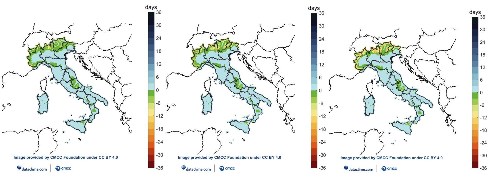 Juegos Olímpicos. The images - from left to right - show the incremental impacts of low, medium and high emissions scenarios on the number of days in a given snow season for the 2036-2065 period (compared to the 1981-2010 reference peri