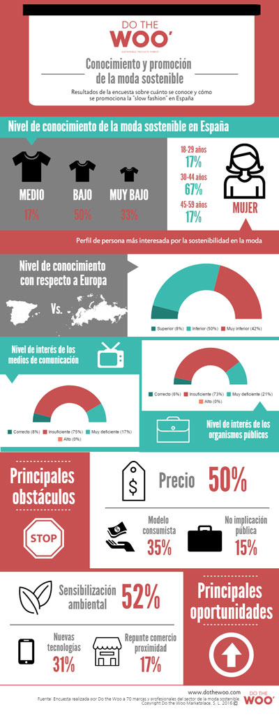 La tienda online de moda sostenible Do the Woo ha realizado una encuesta a cerca de 70 marcas y personas relacionadas con el sector de la moda sostenible sobre el nivel de conocimiento y de promoción de la moda sostenible en España y de las respuestas obtenidas se extraen los siguientes resultados (se adjunta infografía).